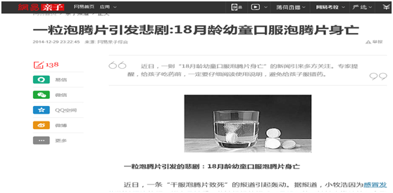 小牧浩因为感冒发烧,在一家省级医院挂吊针。除了输液,医生还配了两盒药,一盒“娃娃宁泡腾片”,药盒上有一张标签,写着“口服” 。过了10多秒钟,孩子的手脚突然抖动起来,紧接着开始剧烈地咳嗽,嘴边也慢慢变成了青色。看着儿子表情异常,摇晃他的身体也没有反应,年轻的母亲一下子懵了!“当时就感觉他肯定是噎着了。”这突如其来的意外让年轻母亲变得十分紧张,手足无措。在一旁的孩子父亲牧华还算清醒,立即抱起孩子喊来医生。用力拍打背部,催吐,很多方法试过后,小牧浩的症状还是没能得到解决。而此时,孩子的心跳和呼吸都已经十分微弱,被送进抢救室进行手术。切开气管后,医生终于取出已经化为一摊水的泡腾片残迹。